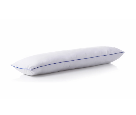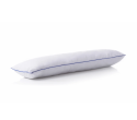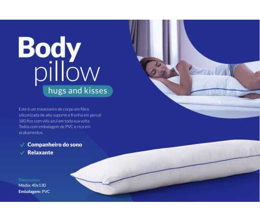 Este é um travesseiro de corpo em fibra siliconizada de alto suporte e fronha em percal 180 fios com viés azul em toda sua volta. Todos com embalagem de PVC e rico em acabamentos.